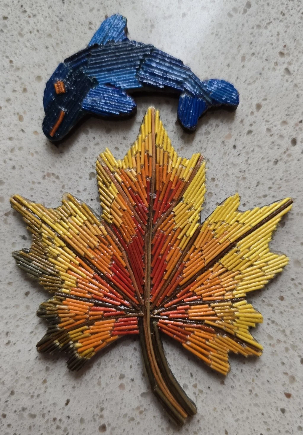 12/2/2025: For several weeks now, I’ve been participating in a program for veterans (Tuesdays at the Holter Museum of Art) called “Courage to Create”. We’ve dipped our toes (figuratively speaking) into a number of mediums, including one we finished with today: “Popotillo”. A Mexican artform, it uses very thin dried and dyed straw, pressed into a backing covered in beeswax, to create images. Google it up and be amazed by what the Mexican artists can do with this… we are, of course, at a much more elementary level. Here are my two pieces (below). For a sense of scale, the “leaf” is about two and a half inches across.