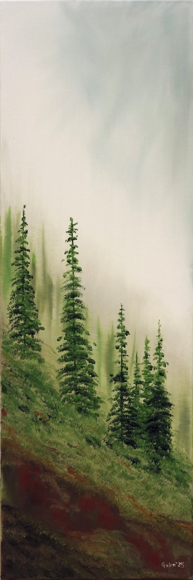 Below: Conifers in the Mist, oil on canvas, 12” w x 36” h, Galen ‘Mac’ McAllister, 2025 ($200 unframed).